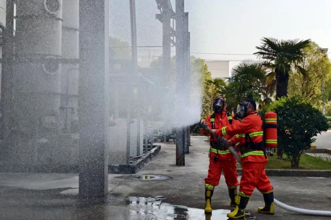 本次演练模拟了股份公司二车间C5区域乙醇管道泄漏起火事件,完整呈现了从隐患发现到险情升级的全过程。当班人员发现乙醇管道法兰泄漏,在紧急处置过程中因静电引发“火情”;班长立即组织初期灭火与人员疏散,车间主任随即启动车间级应急预案并上报公司;公司消控中心接报后,总指挥牛犇研判险情,果断下令启动公司级危险化学品事故综合应急预案,并任命现场应急指挥长;治安保卫、抢险救援、医疗救护等各应急小组迅速响应,高效完成现场警戒、工艺隔离、人员清点等关键任务。当“火势”呈现蔓延趋势时,现场指挥部立即向邗江区消防救援大队报警求援,顺利完成指挥权交接与现场技术交底;企消双方紧密协同,迅速扑灭明火,成功处置险情。整个流程环环相扣,有效检验了应急响应机制的灵敏性与协同作战能力。